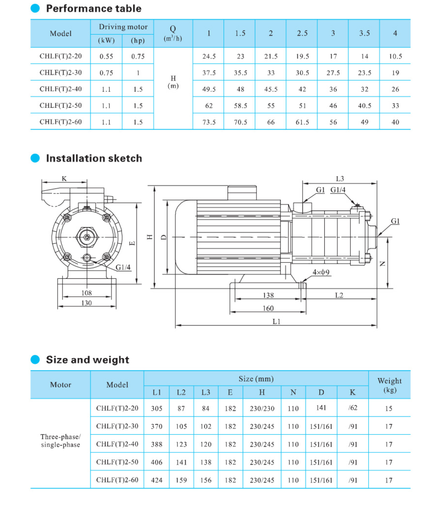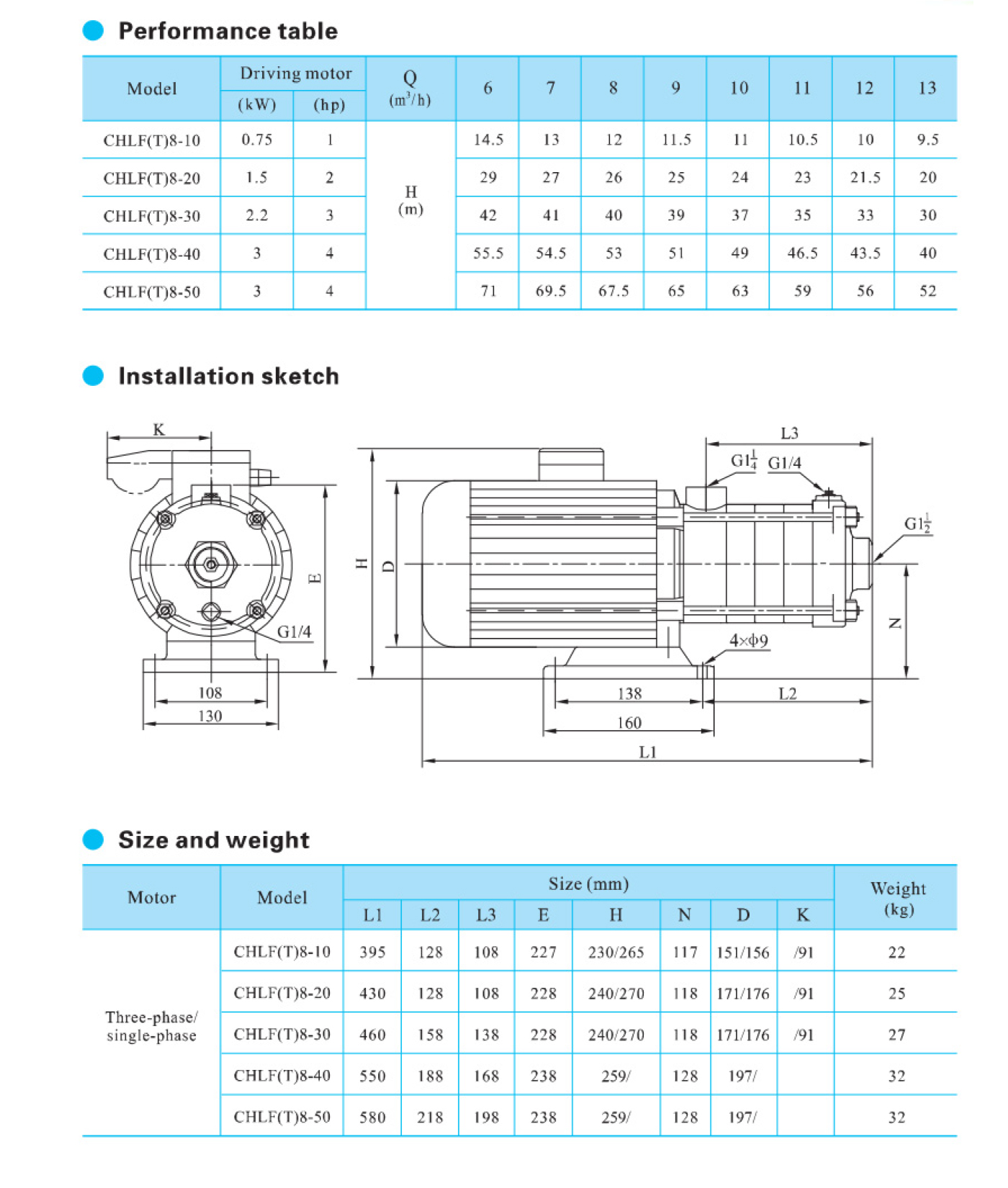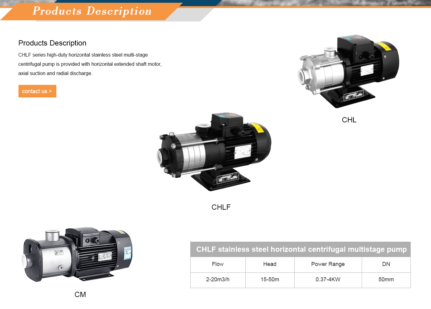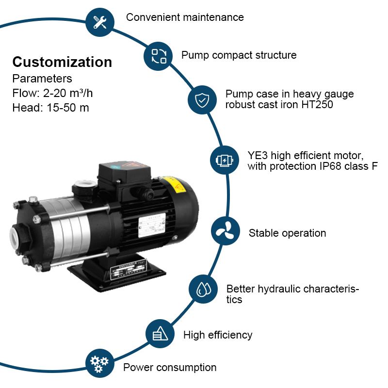 A bomba centrífuga multiestágio horizontal de aço inoxidável de alta resistência da série CHLF é fornecida com motor de eixo estendido horizontal, sucção axial e descarga radial.