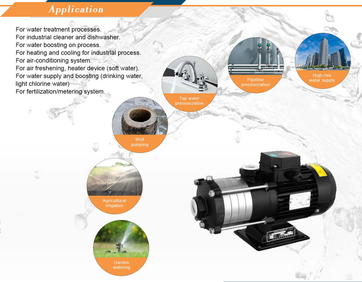 - Usado para circulação de água e líquido limpo em sistemas de aquecimento, ventilação e ar condicionado, e para aumento de pressão em aplicações industriais.